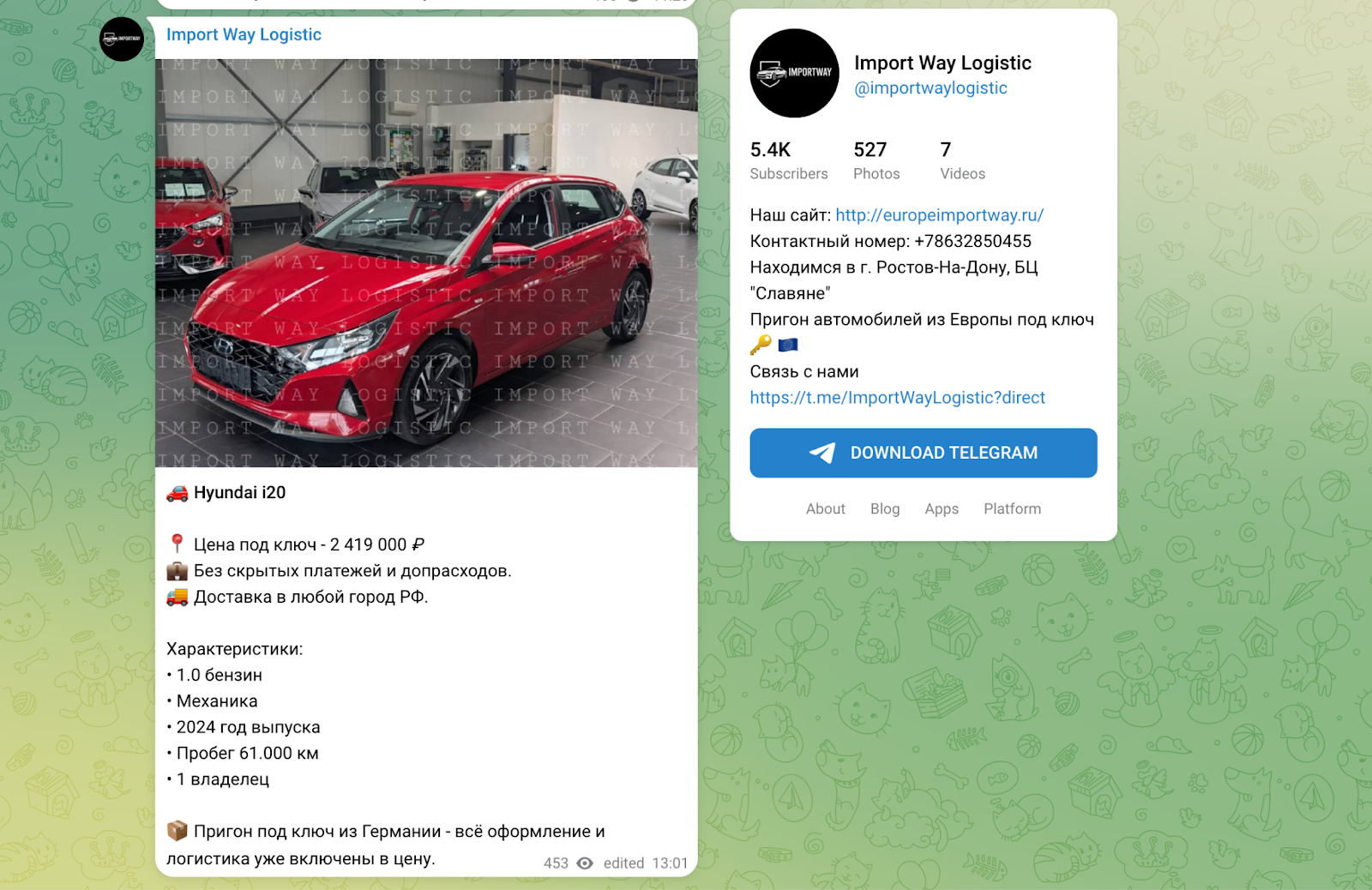 Основной контент в Телеграм — карточки автомобилей. В постах указывается марка, модель, годы выпуска, пробег, тип двигателя, иногда комплектация и итоговая цена под ключ. Используются стандартные формулировки в данной нише типа доставка в любой город, открытые платежи и тд. Подобные фразы часто являются маркетинговым ходом и требуют проверки на уровне договора, но сам факт системной публикации предложений говорит о том, что канал используется как рабочий инструмент продаж, а не просто витрина без реальных сделок.