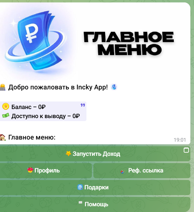 Incky App — бот в Телеграмме, предлагающий зарабатывать непосредственно в соцсети. Пользователям раздают подарки и позволяют участие в реферальной программе. Можно просто нажать на кнопку Запустить доход и начать инвестировать. При этом обещанная доходность составляет 180% в час. В обзоре ниже рассмотрим, что собой представляет платформа. Поговорим о том, стоит ли ей вообще доверять.