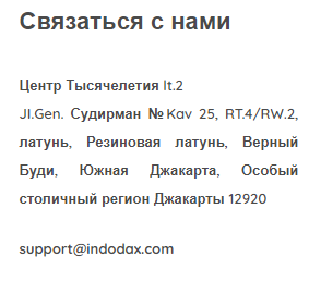 «Индодакс» зарегистрирована в Джакарте, здесь же располагается ее головной офис. Есть представительство на Бали. Сканы лицензий не демонстрируются. Для связи с техподдержкой дается email, телефон, онлайн-форма в виде тикета. Веб-ресурс работает на индонезийской, китайском, английском языках.