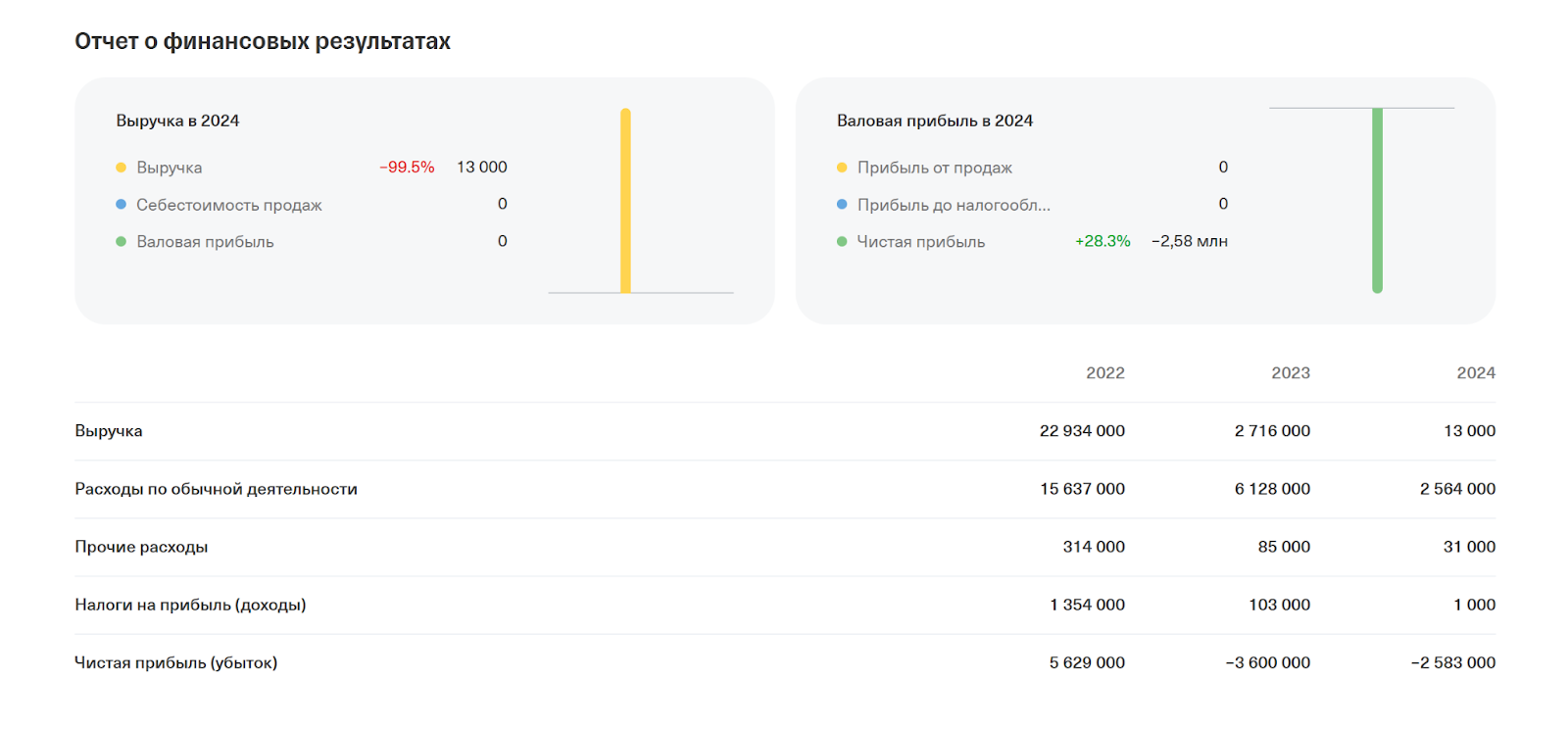 Самое интересное заключено в бухгалтерской отчетности. Так в 2022 выручка конторы составила 22 миллиона, расходы около 16 млн, а чистая прибыль находилась на уровне 5,6 млн рублей. В 2023 показатели резко ухудшились: выручка 2,7 млн, расходы 6,2, убыток превысил 3,6 млн рублей. В 2024 году наступил кризис, при выручке в 13 000 был получен убыток в размере 2,5 млн. Однако компания до сих пор не свернула свою деятельность, не подала на банкротство. Стоит отметить, что арбитражных дел у организации Бесконечный Мир нет.