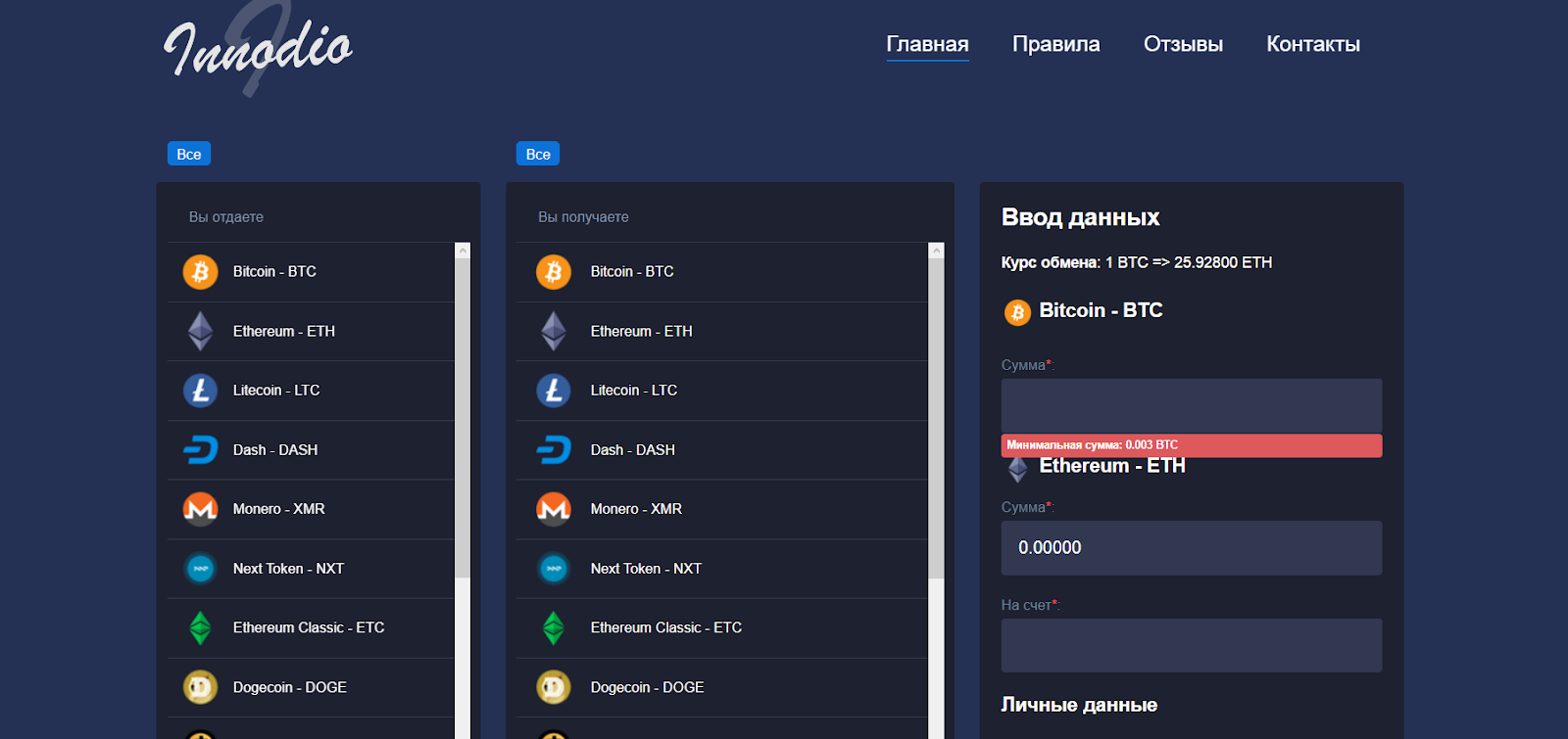 Innodio com: надежный ли обменник, условия работы сервиса и отзывы о проекте