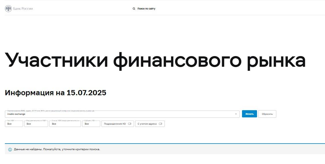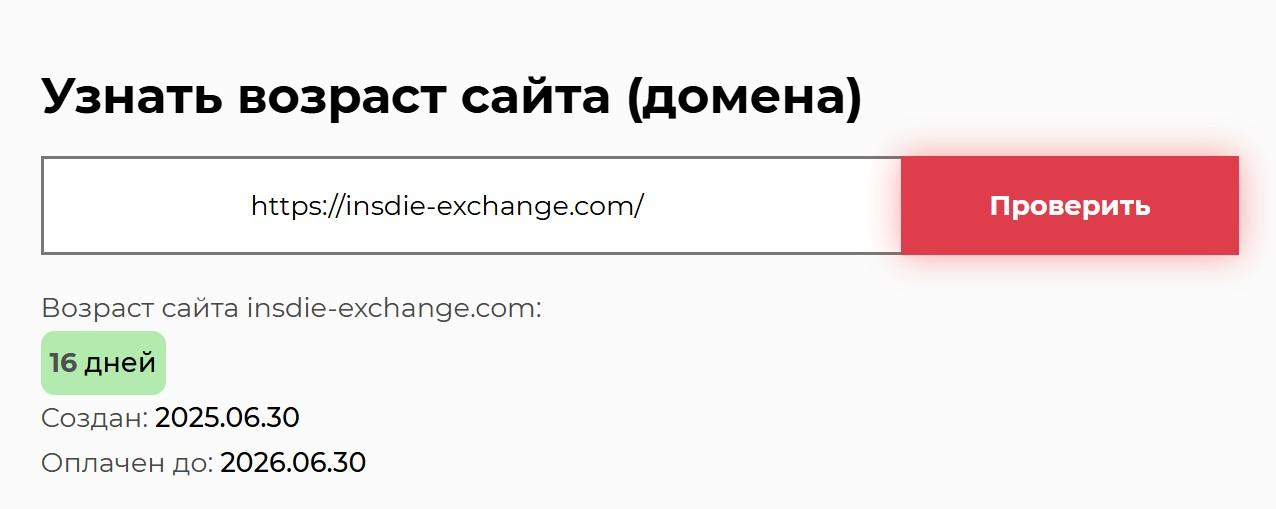 Отзывы о insdie exchange com в сети отсутствуют. Это связано с тем, что платформа существует всего 16 дней. Возможно, ею еще никто не успел воспользоваться.