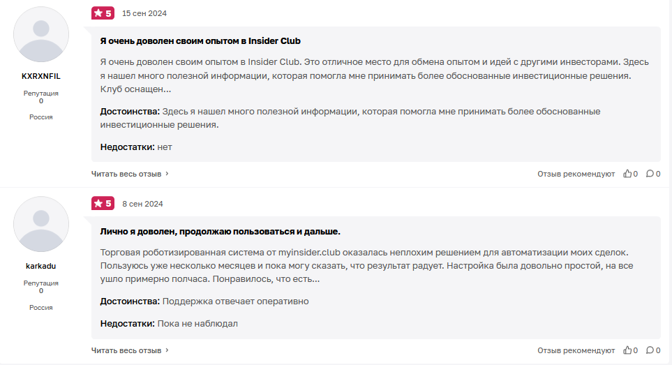 Есть также отзывы о Myinsider Club на известных платформах для комментирования, но там позитивные комментарии оставлены ноунемйами без репутации.