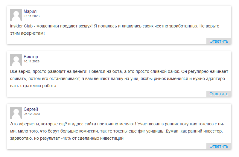 В негативных отзывах об “Инсайдер Клаб” пользователи сообщают, что сотрудничество приводит лишь к частичным или полным потерям вложенных средств.