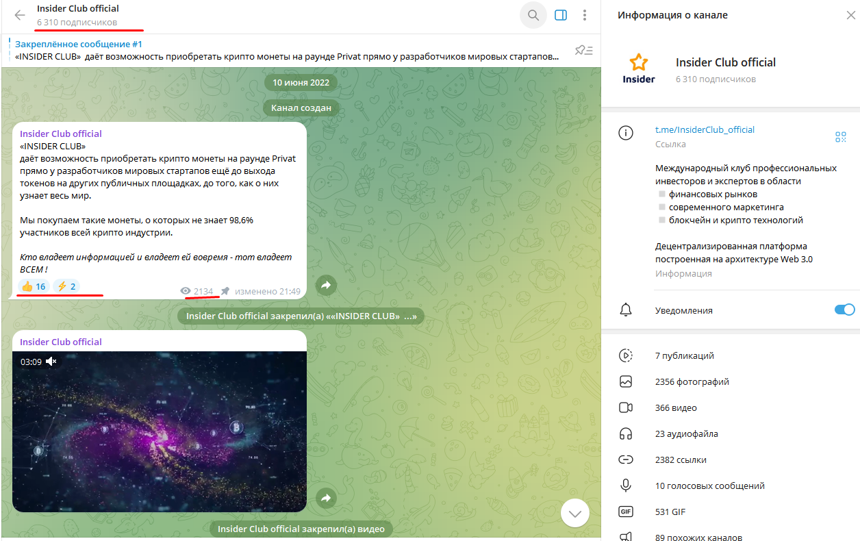 Телеграмм-канал Insider Club official запустили 10.06.2022. Там чуть больше 6 тыс. подписчиков, а на постах порядка 2 тыс. просмотров. При этом чат для инвесторов отсутствует, посты прокомментировать нельзя, а на них от силы 10-20 эмодзи. Подобная статистика позволяет допустить мысль, что показатели подписчиков и просмотров накручиваются искусственно.
