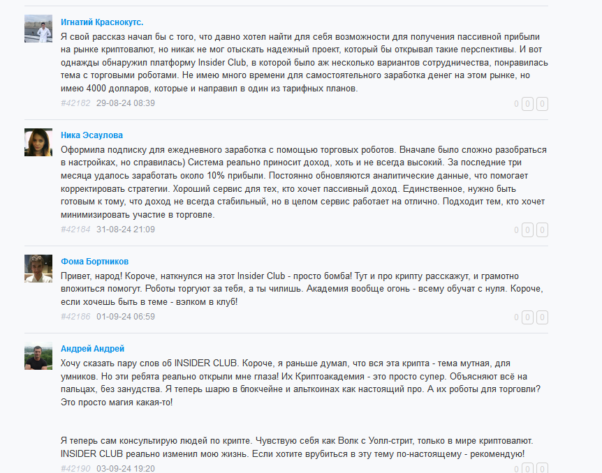 В Сети полно комментариев как положительного характера, так и отрицательного. И это может сбивать с толку человека, пытающегося узнать больше о “Майинсайдер Клаб”. Позитивные комментарии встречаются целыми ветками. В них пользователи активно хвалят различные аспекты работы клуба. Причем, что подозрительно, оставляют они свои сообщения довольно регулярно.