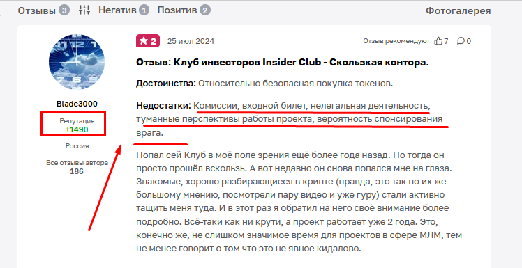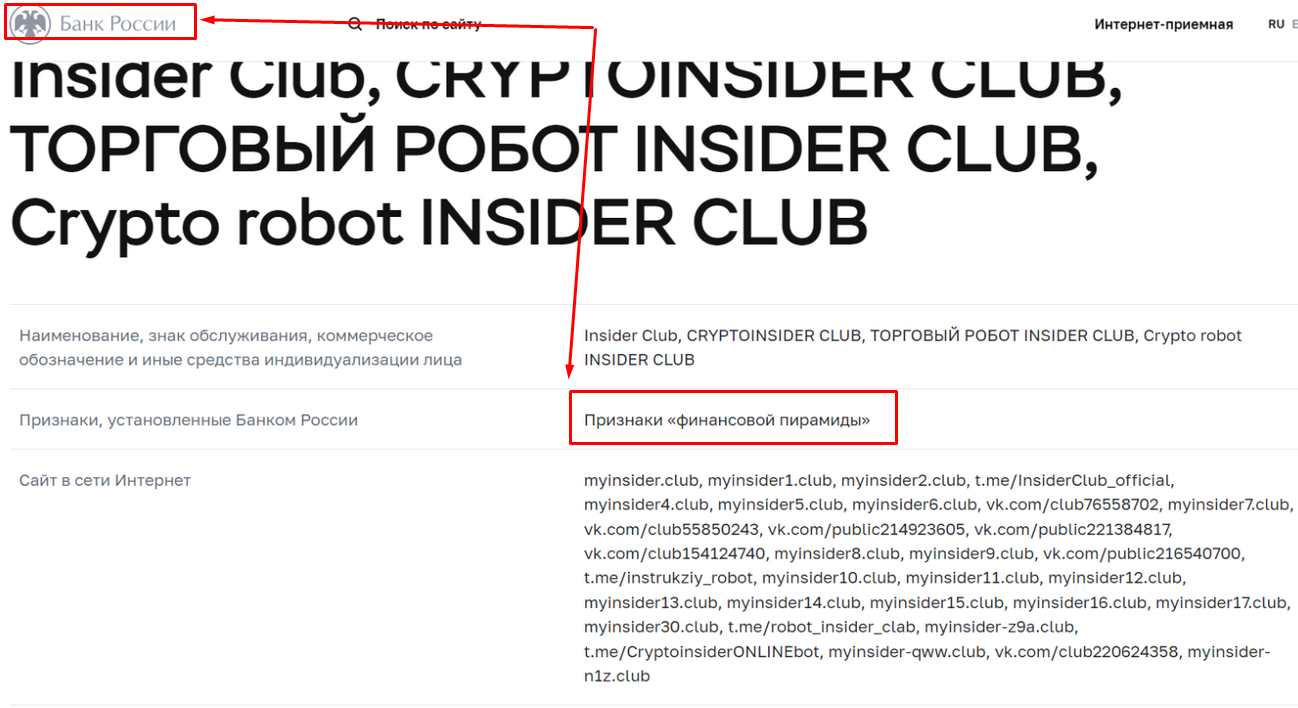 В одном из отзывов об Insider Club даже приводится скриншот с официального сайта ЦБ РФ, где говорится, что деятельность клуба имеет все признаки финансовой пирамиды.