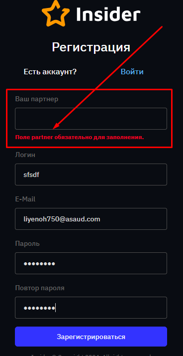 Официальный сайт myinsider club/ru представляет собой простой одностраничник. При попытке зарегистрироваться там придется в обязательном порядке указать партнера. Ну а это явный признак MLM-проекта или по-простому – финансовой пирамиды.