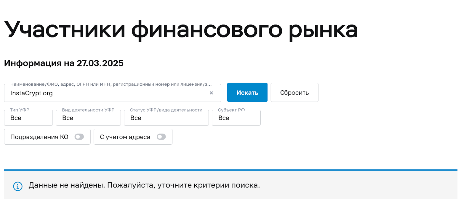 По закону о ЦФА от 2020 года оператор обмена должен быть зарегистрирован в РФ, но такого финансового агента в реестре ЦБ РФ нет.