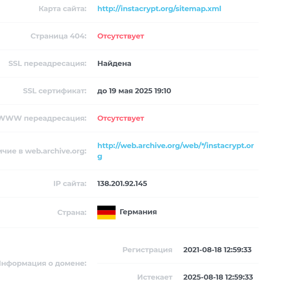 Владельцы сервиса InstaCrypt говорят о своем многолетнем опыты, хотя и не называют дат регистрации. По данным мониторинга, сайт существует более 3 лет, что вполне подтверждает легенду о многолетнем опыте.