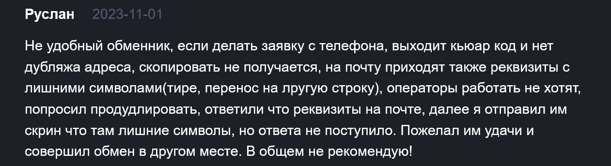 Сервис ведет незаконную деятельность в России, что подтверждается данными мониторингового сервиса Exnode ru. В августе 2024 года этот обменник считается неактивным.