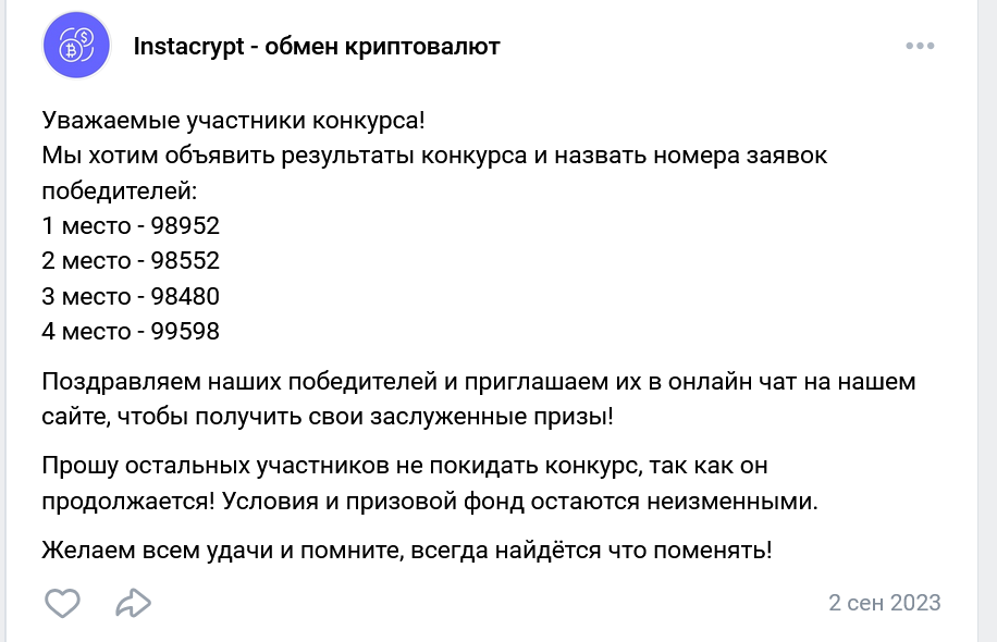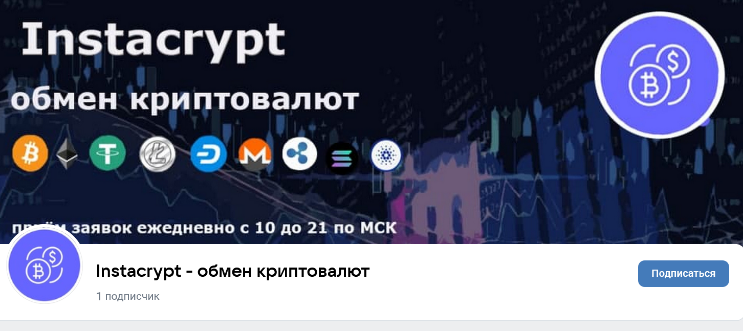 Помимо блога у обменника InstaCrypt есть страница в ВК, где, раньше можно было заказать обмен online или узнать, как получить наличные.