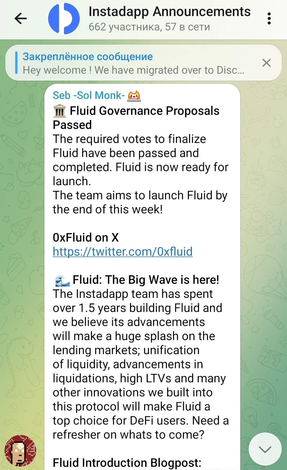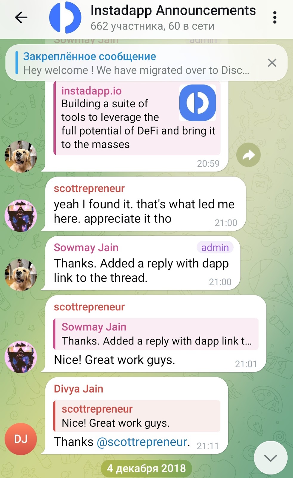 Проект продвигается через канал в Телеграмм — Instadapp Announcements. Он ведется в формате чата. Участники сообщества могут тут задавать вопросы администратору и общаться друг с другом. Администратор выкладывает информацию по обновлениям, времени проведения технических работ. Группа ведется исключительно на английском языке. По состоянию на 5 марта 2026 год у нее всего 662 подписчиков. Просмотры закрыты. Писать комментарии и оставлять комментарии в чате тоже запрещено. Это выглядит странным как для честного и надежного проекта.