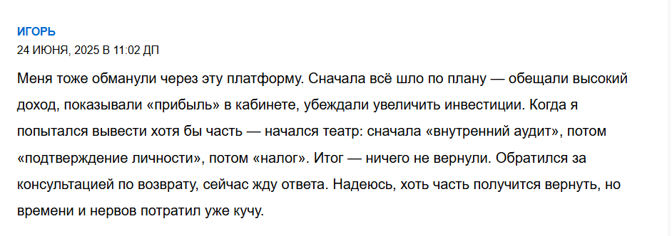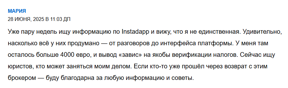Биржу Инстандапп называют скамом. Жалуются, что ее представители мотивируют переводить на нее крупные суммы, демонстрируют зачисление прибыли. Но при подаче заявки на выплату начинаются проблемы. Клиентов просят пройти внутренний аудит, далее подтвердить личность, потом — оплатить налог. Но в итоге деньги так и не выводят. Вот что пишут об этой площадке ее реальные пользователи:
