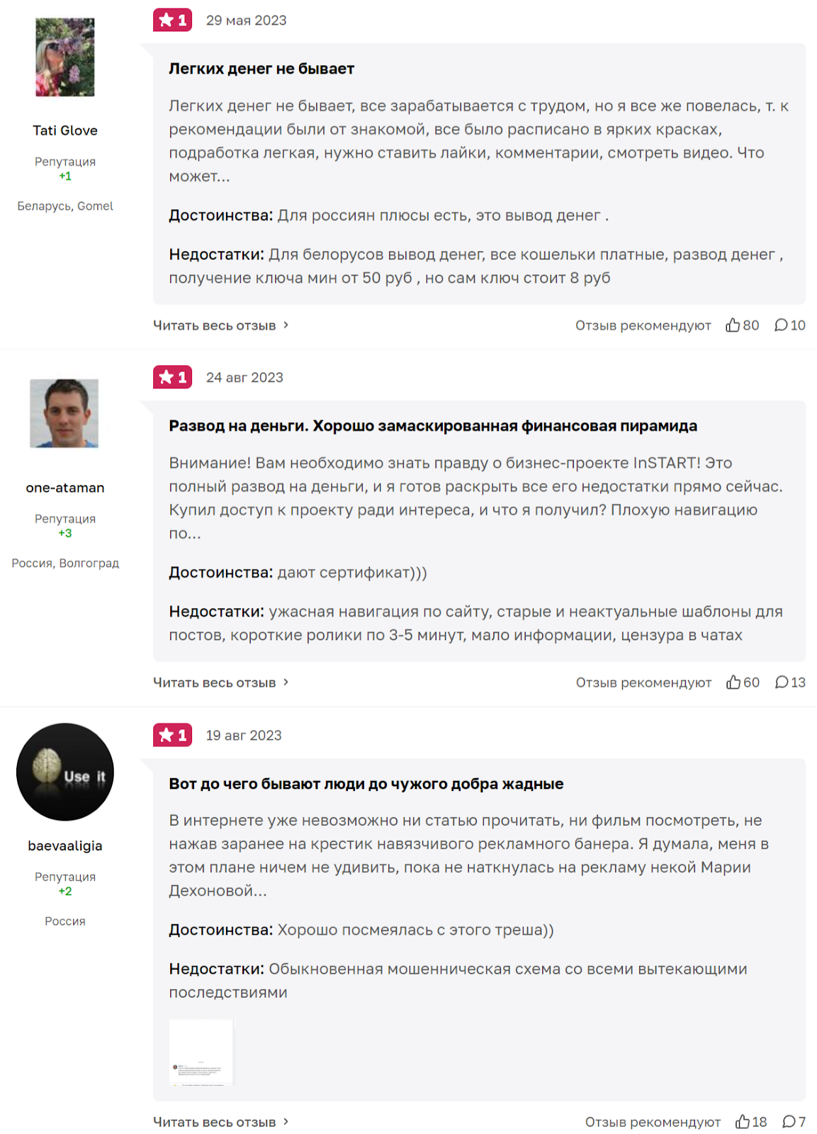 Изучение реальных отзывов об Инстарт показывает, что пользователи явно не довольны качеством услуг. Они жалуются на плохую навигацию на сайте, устаревшие шаблоны для публикаций, применение мошеннических схем развода клиентов.