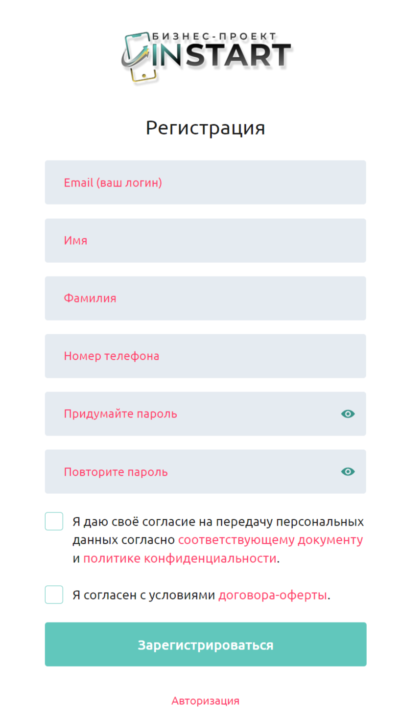 В качестве главного источника информации выступает официальный сайт instastart pro ru. Он имеет закрытый тип и доступен только после регистрации. Сам процесс требует ввода электронного ящика, имени и фамилии, номера телефона и пароля.