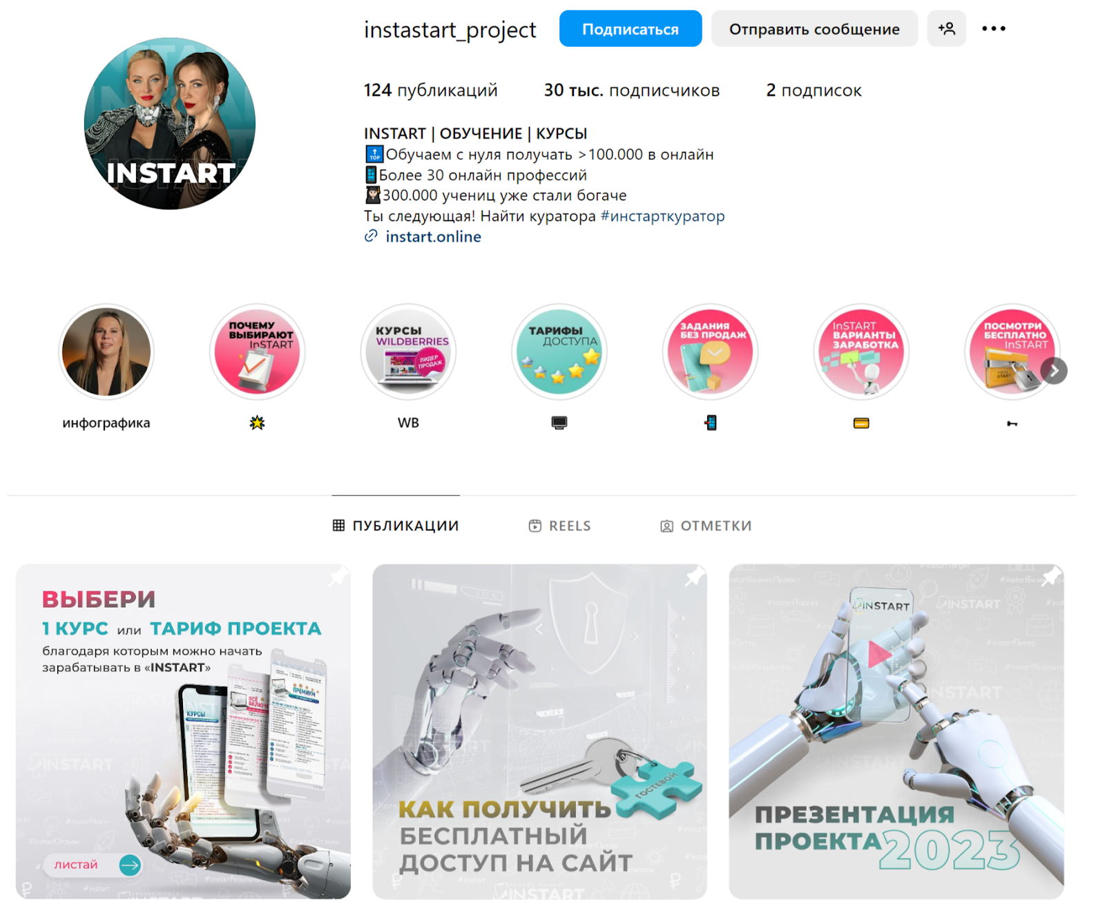 - Инстаграм — instastart_project. В описании создательницы предлагают к нескольким десяткам профессий. В публикациях можно найти информацию по бесплатному доступу на сайт, презентации проекта, рекомендациям по маркировке интернет-рекламы и т. д.