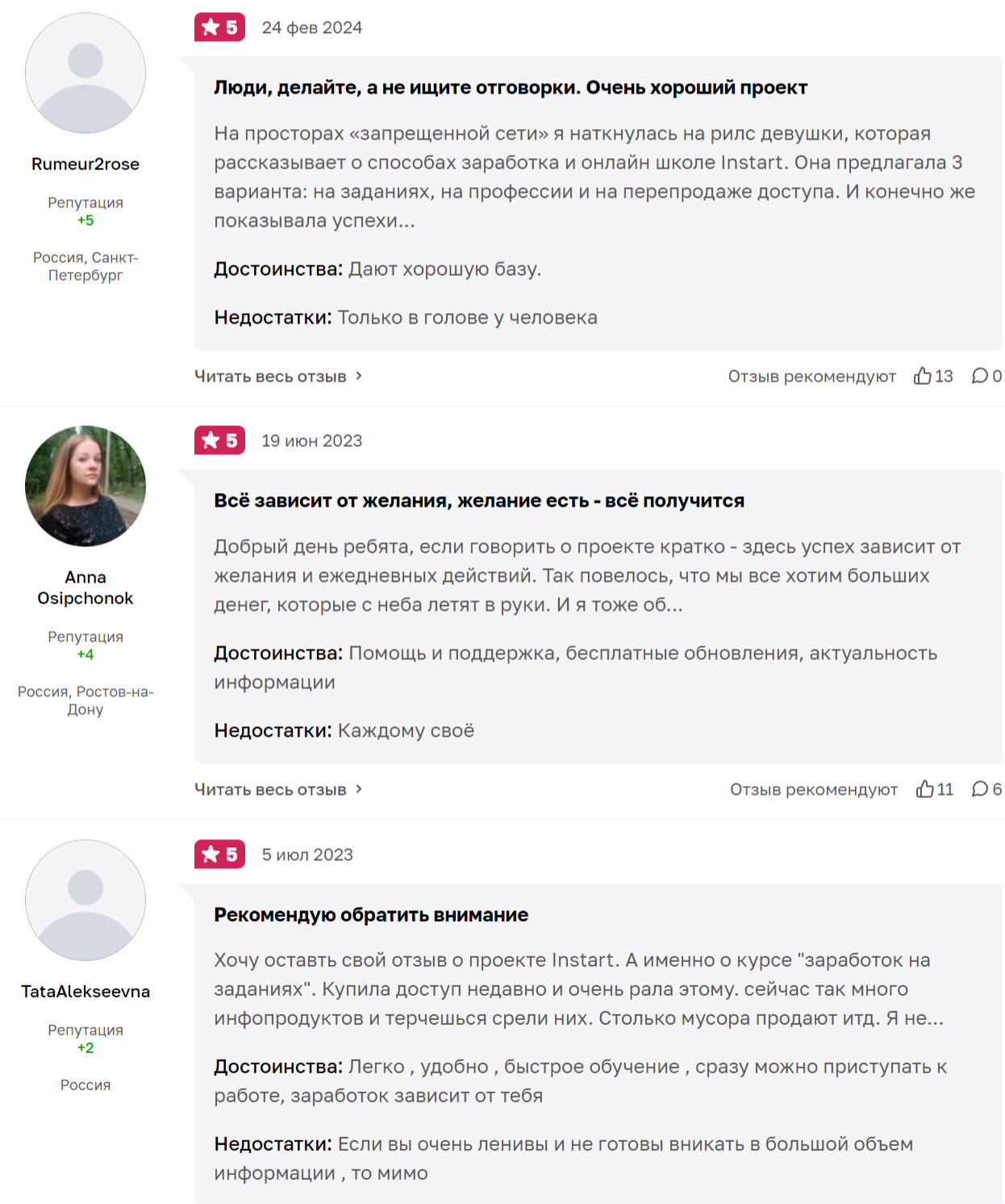 Нельзя не отметить и положительные отзывы об Инстарт о заработке на заданиях. В них ученики отмечают хорошую базу, помощь и поддержку на разных этапах обучения, наличие бесплатных объявлений и бесплатность информации. Пользователи отмечают легкость усвоения информации и доступную цену.