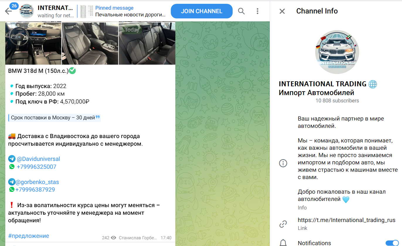 Тг-канал International Trading Привоз Авто отзывы на сторонних ресурсах еще не получил. Сообщество посвящено продаже автомобилей различных марок. Основатели обещают покупателям индивидуальные условия доставки, выгодные цены и качество, и в статье мы расскажем о деятельности проекта в деталях.