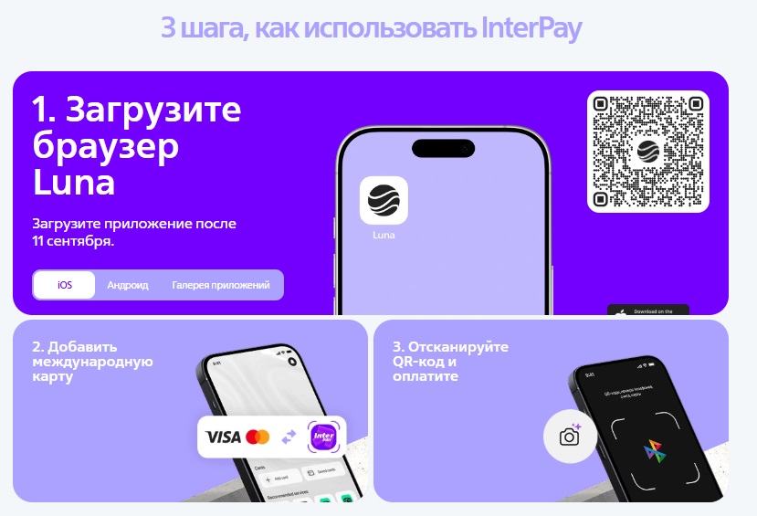 InterPay — продукт для приема оплат в РФ с карт эмитированных за рубежом. Платеж формируется через скан QR-кода, списание происходит с международной Visa/MasterCard. Сервис делает упор на работу через мобильный браузер Luna и обещает простую оплату в три шага.