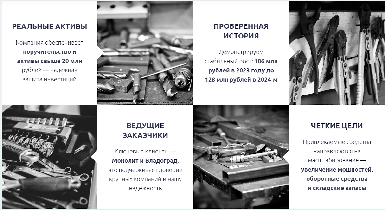 Представители компании гарантируют наличие поручительства, в том числе с привлечением имущественных активов. Также клиентам хвалятся о ведении деятельности в сфере импортозамещения и управлением рисками.