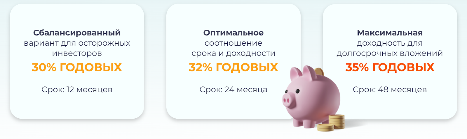 - Оптимальный. Предусматривает большую доходность на уровне 32% в год. В этом случае периодичность выплат составляет раз в два года.