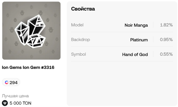 Telegram NFT Ion Gem — это ограниченная коллекция, реализована на блокчейне The Open Network. Для каждого подарка характерны следующие атрибуты: