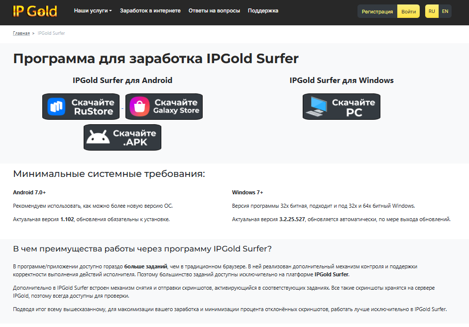 Поэтому не стоит рассматривать Ip Gold как полноценную платформу для заработка, ведь вы вряд ли сможете получить больше ₽100 в день, но и такая прибыль для кого-то будет считаться приемлемой. Получить больше денег можно при установке приложения на компьютер, которое будет в фоновом режиме открывать разные сайты, оптимизируя время исполнителя.