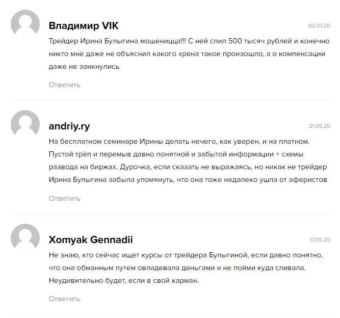 По отзывам, трейдер Ирина Булыгина предлагала обучающие курсы в среднем за 1 000 рублей. По итогам клиент получал кучу бесполезной информации по активам, набору позиций и других, всем известным мелочам.