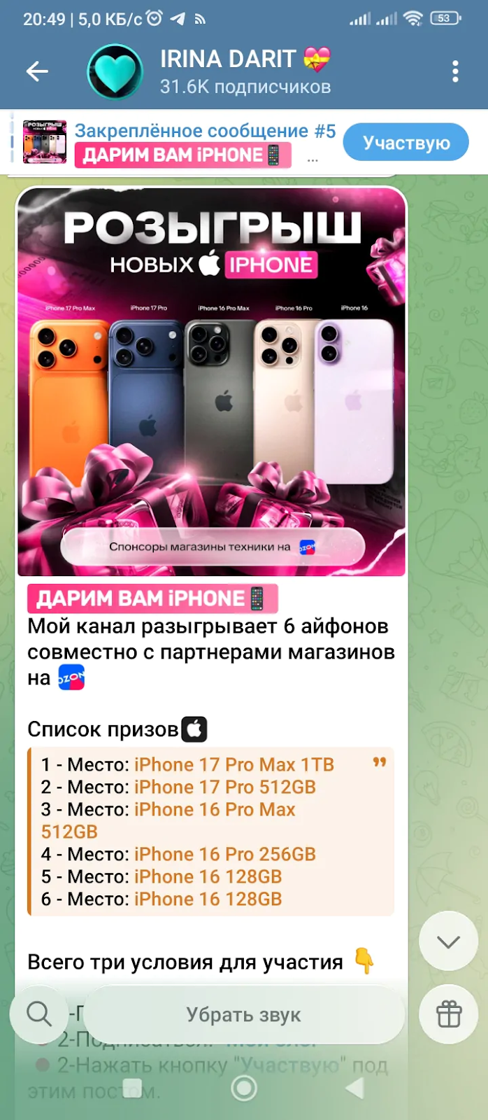 Судя по отзывам о телеграм-канале «Ирина дарит» жертвы, перечислившие Olga Romanovna деньги, новых айфонов не увидели. Каждый из «счастливчиков» был заблокирован автором канала. Такой исход вполне закономерен. Ведь никто из «победителей» лотереи предварительно не спрашивал о легальности розыгрышей, правовом статусе организатора и гарантиях для себя.Обзор ТГК Irina Darit