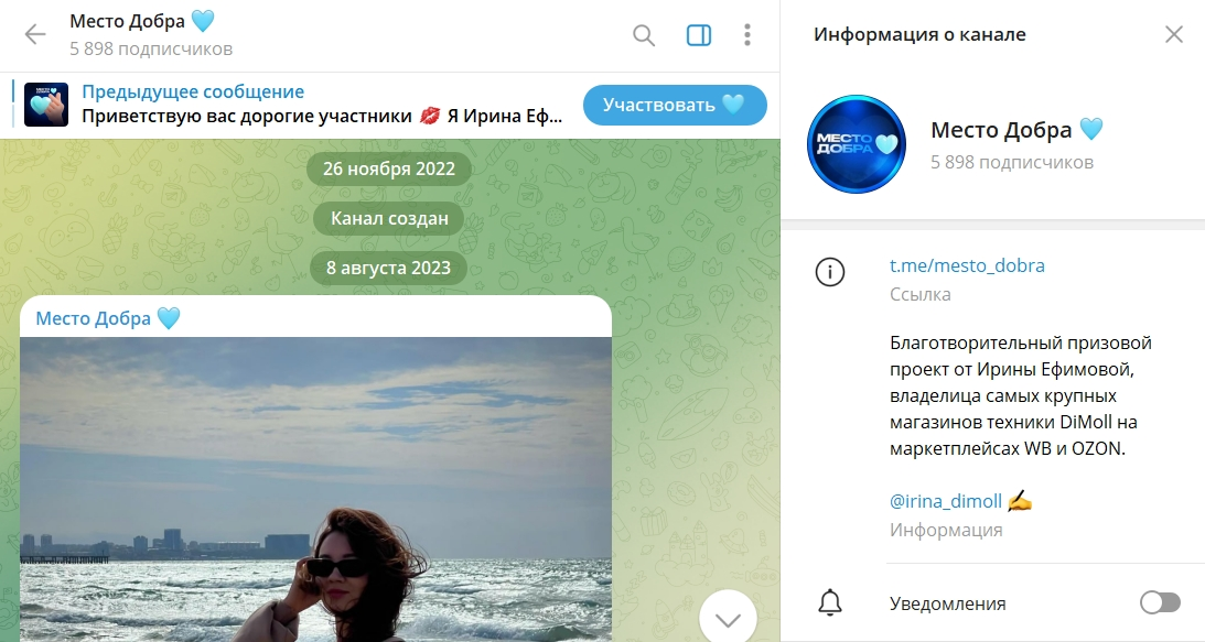 Телеграм-канал Irina Darit, он же «Мир ДОбра», IRINA’S BLOG и т. д. обосновался в мессенджере 26 ноября 2022 года. На заре своей деятельности проект имел почти 6 000 подписчиков. На закате работы на телеграм-канал о разводе на деньги Irina Darit было подписано порядка 32 000 пользователей. Публикациями автора интересовались около 3% аудитории. Невооруженным глазом была видна накрутка ботами. На момент обзора из-за многочисленных жалоб канал прекратил свою преступную деятельность.