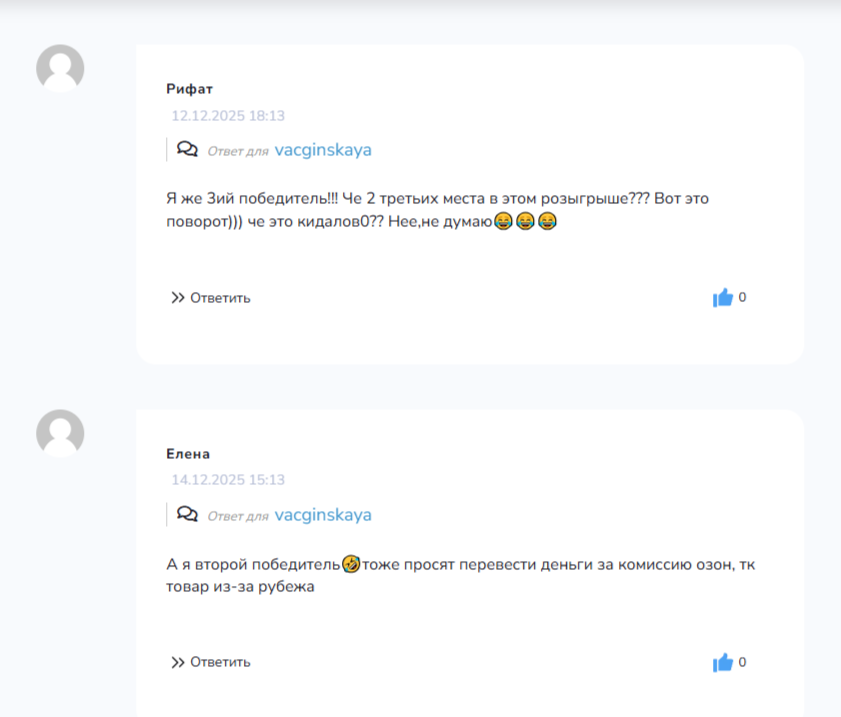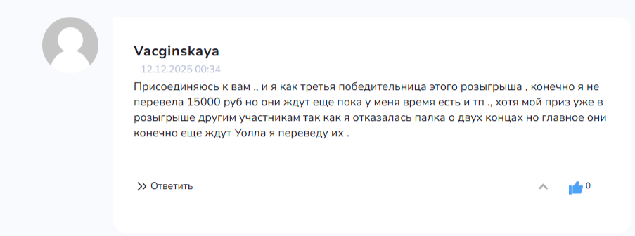 За достаточно приличное время работы в мессенджере владелица «благотворительного» канала не получила ни одного позитивного комментария в свой адрес. Нами не были обнаружены отзывы о канале в Телеграме «Ирина дарит», в которых победители розыгрышей благодарили организатора за ценные призы.