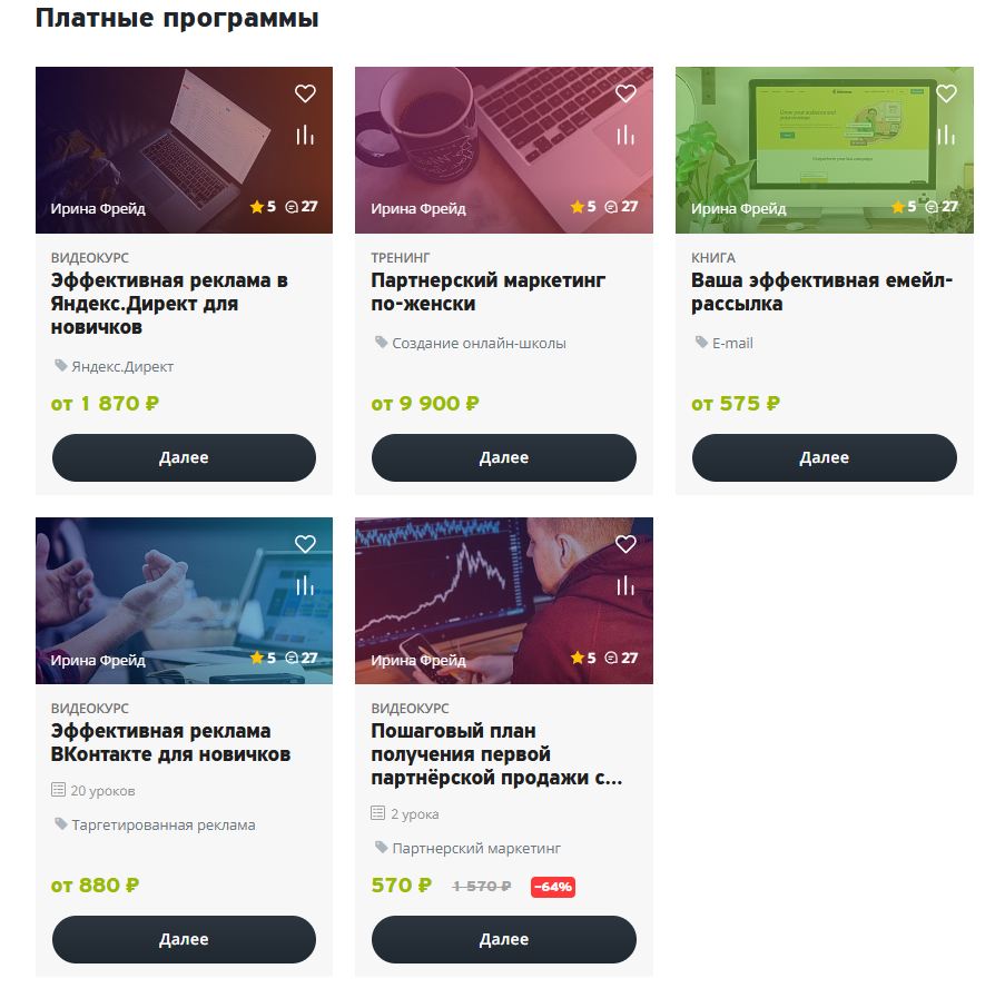 У Ирины Фрейд имеются бесплатные материалы: книги, полезные чек-листы и обучающие сборники, например, «Партнерский маркетинг: от старта до первых продаж» и «Понятный старт в партнерках». Также в ассортименте представлены платные образовательные курсы:
