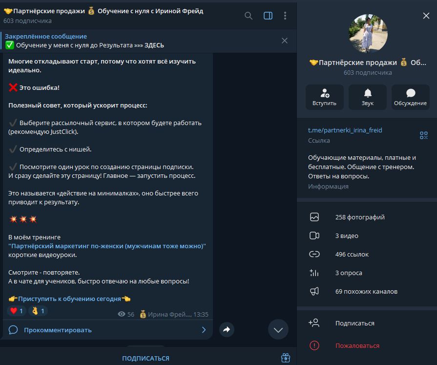 • подписчиков в телеграм-канале «Партнерские продажи Обучение с нуля с Ириной Фрейд» (partnerki irina freid) Ирины Фрейд порядка 600 человек, при этом посты просматривает 10% аудитории. Это может свидетельствовать как о безразличии части подписчиков к контенту, так и искусственной накрутке.