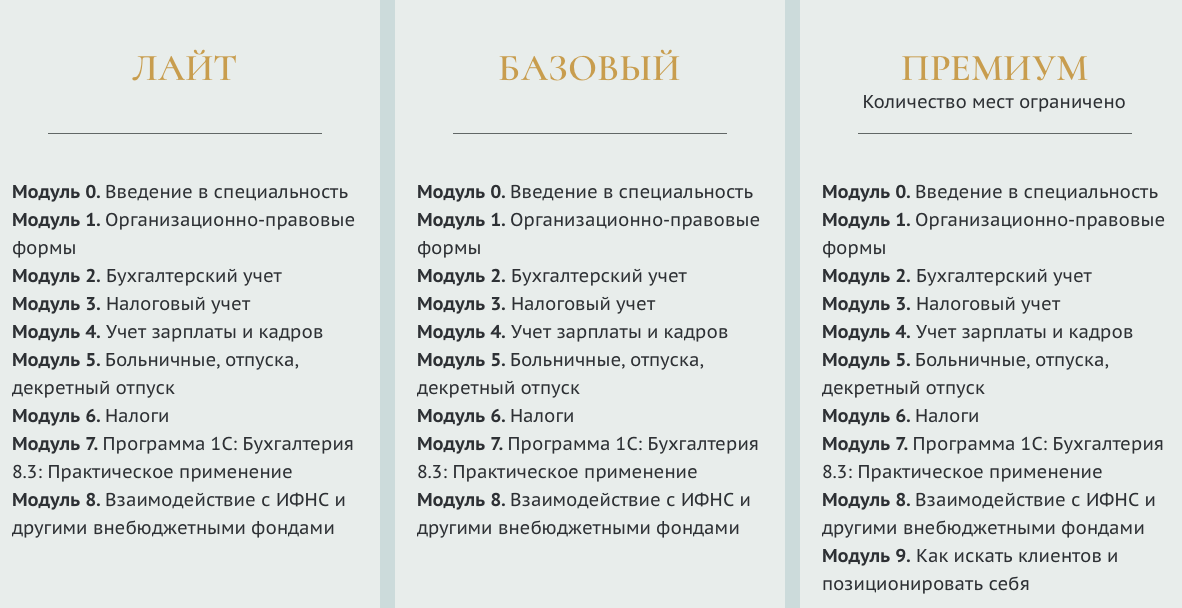 На выбор предлагают три пакета на курс «Ваш бухгалтер Ирина Смирнова», от базового до улучшенного. Тарифный план «Лайт» обойдется в 36 740 рублей. В него входят базовые модули от введения в профессию до 1С и взаимодействия с фондами. «Базовый» курс стоит 83 990 рублей, включает полный пакет плюс практические навыки по зарплате, кадрам и больничным.Тариф «Премиум», места на который ограничены, стоит чуть более 120 000 рублей. Это пакет с модулем про поиск клиентов и позиционирование себя как специалиста. Во всех тарифах есть сертификат или диплом о профпереподготовке, доступ к материалам и акцент на практику. Рассрочка без переплат делает вход довольно мягким для тех, кто только начинает.
