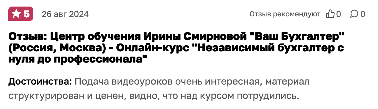 В VK и Telegram периодически появляются свежие истории учеников, которые уже ведут свою бухгалтерию или вышли на фриланс. Конечно, попадаются и нейтральные отзывы, где пишут, что ожидали большего. Кому-то не хватило личного сопровождения, другим — глубины программы. Общий рейтинг держится на уровне 5.0 при десятках оценок.