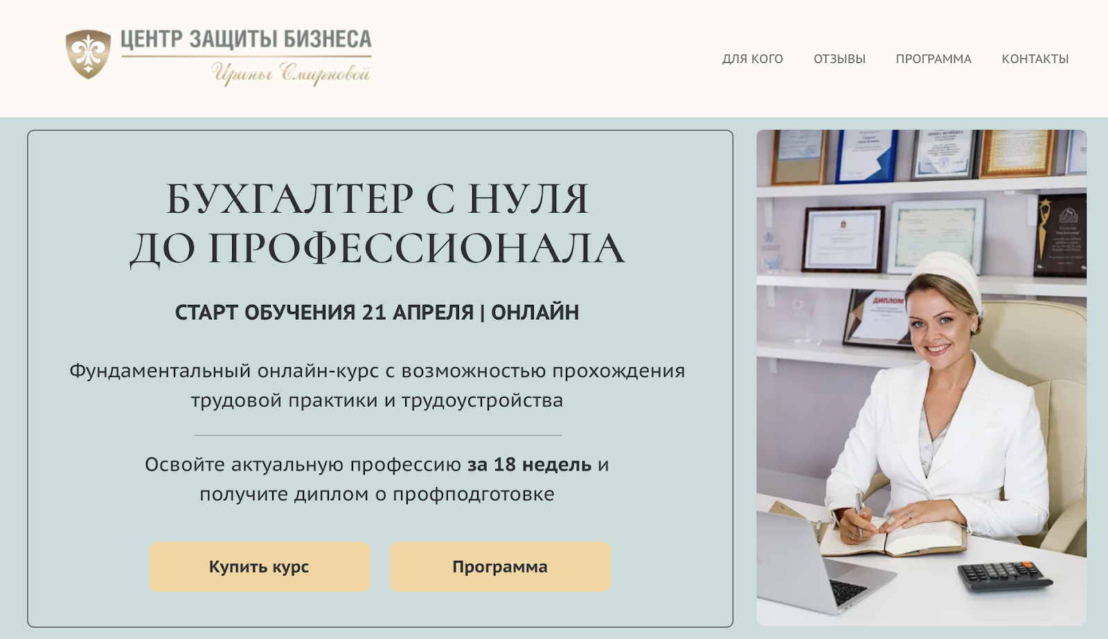 Обучающий проект «Ваш бухгалтер Ирина Смирнова» и ее «Центр Защиты Бизнеса» — один из самых любопытных кейсов для нашей редакции. Не один год данная коуч приглашает людей обучаться довольно непростому делу — бухгалтерскому. Причем обучаться Смирнова предлагает в онлайн-формате по довольно лояльной цене. В рамках программы практикующий специалист обещает быстрое и при этом полноценное освоение сложной специальности.