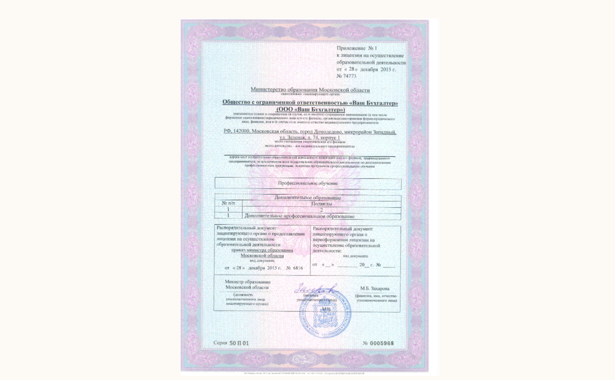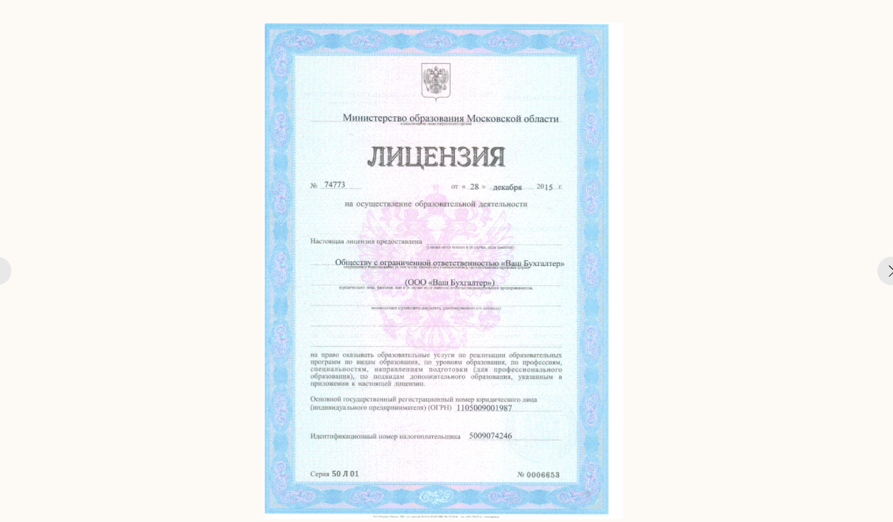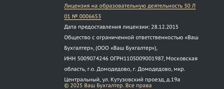 Здесь все выглядит максимально прозрачно и чисто. Образовательная деятельность ведется через ООО «Ваш Бухгалтер» с лицензией от 2015 года, выданной Минобразования Московской области. Документ действующий, данные ИНН, ОГРН и адрес в Домодедово совпадают.