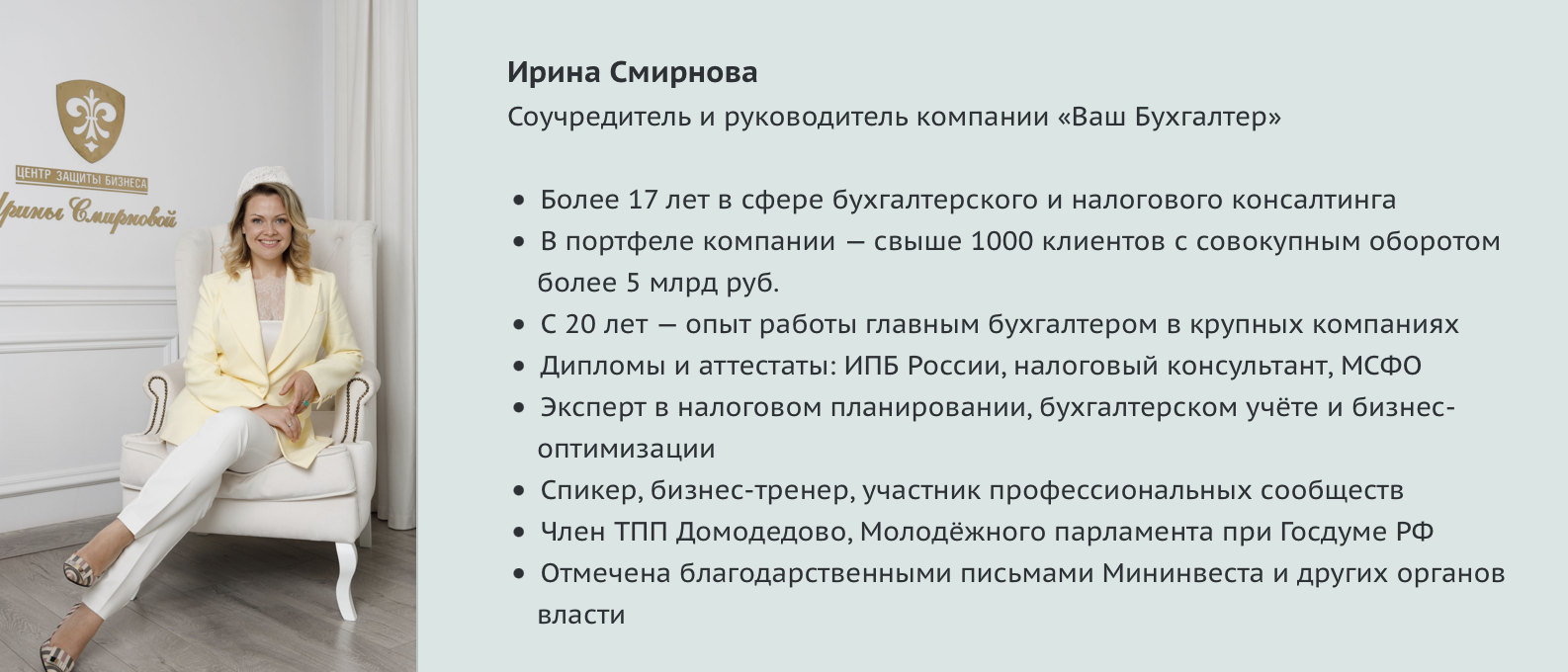 Ирина Смирнова — не очередной инфокоуч с громкими обещаниями и пустым бэкграундом. Это специалист с реальным досье и опытом в сфере бухгалтерии и налогового дела. Более того, она является официальным соучредителем компании «Ваш Бухгалтер», имеет почти два десятка лет подтвержденного стажа в именитых фирмах. Также на ее счету аттестаты, звание консультантам по налогам и членство в экспертных комиссиях. Все перечисленные регалии находят подтверждение в открытых источниках.