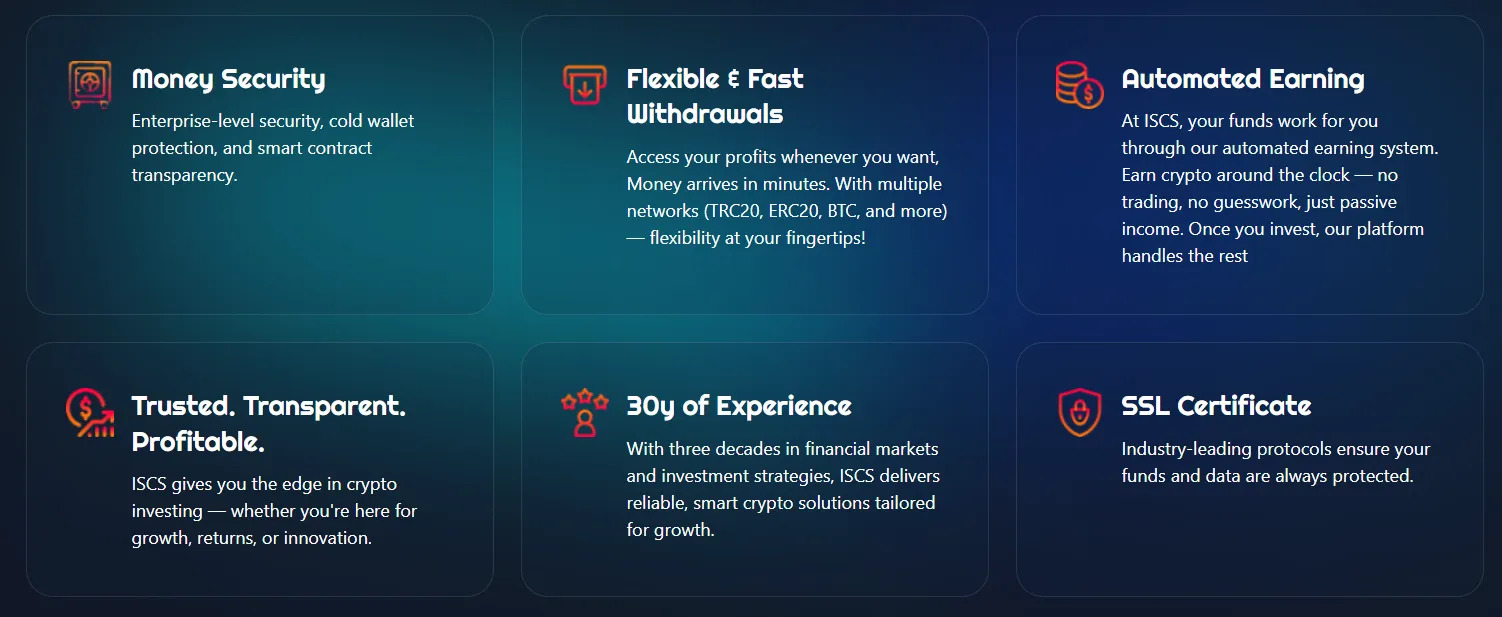 На платформе реализуется стратегия взаимовыгодных вкладов. Перекрестное инвестирование позволяет зарабатывать и клиентам, и компании. Все депозиты застрахованы и защищены от потери. Iscs среди основных принципов прозрачность, надежность и соблюдение действующего законодательства.