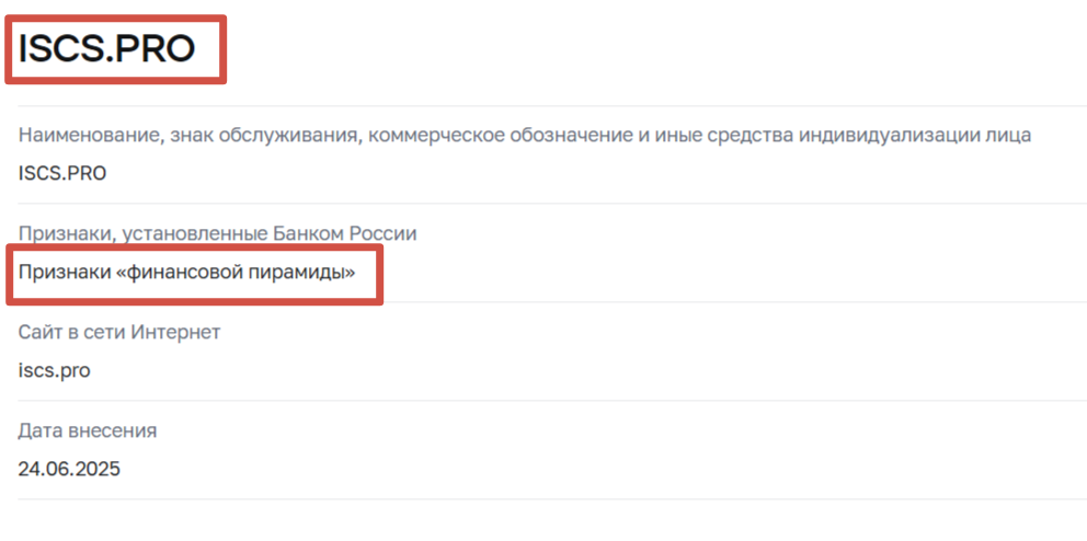 Мы выяснили, что компания внесена Центробанком РФ в черный список 24 июня 2025 года. Проверка показала, что в деятельности «Искс Про» выявлены признаки финансовой пирамиды. Первые клиенты получали доход за счет средств новичков. Ни в какие реальные проекты деньги пользователей не вкладывались, а большая часть средств поступала прямиком в карман создателей скама.