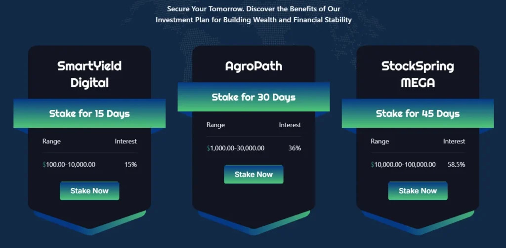 На сайте компании практически не представлено сведений о стоимости услуг, размерах комиссии или налогах. Единственная финансовая информация – описание тарифных планов. Их всего три: для начинающих, для уверенных инвесторов и профессионалов. Минимальный взнос составляет 100 долларов. Однако наиболее привлекательные условия платформа предлагает крупным вкладчикам. Внеся от 10 до 100 тысяч долларов можно рассчитывать на прибыль в 58,5% за 45 дней.