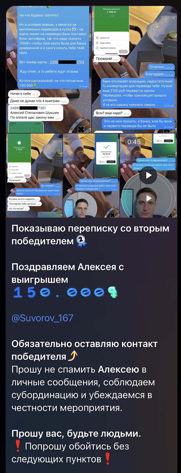 Как видите, суммы достаточно приличные. При этом для получения приза необходимо перевести на счет Ксении ₽1100 и ₽2100 в качестве какой-то комиссии. Необходимость таких платежей поясняют тем, что банки включают антифрод-блокировку, из-за чего переводы выигрышей блокируются.