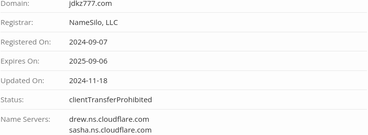 Из открытых источников мы узнали, что компания Jdkz777 com работает с сентября 2024 года. Чтобы подтвердить сведения, наша редакция проверила онлайн-ресурс через WHOIS. И да, действительно, компания работает с 07.09.2024 года. Регистратором в сети выступает ресурс NameSilo, LLC