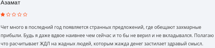Положительной обратной связи о сотрудничестве с онлайн-ресурсом нет. Мы не удивлены, что довольные пользователи отсутствуют. Зато есть отрицательные отзывы. Пользователи называют инвестиционную платформу разводом.