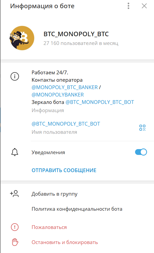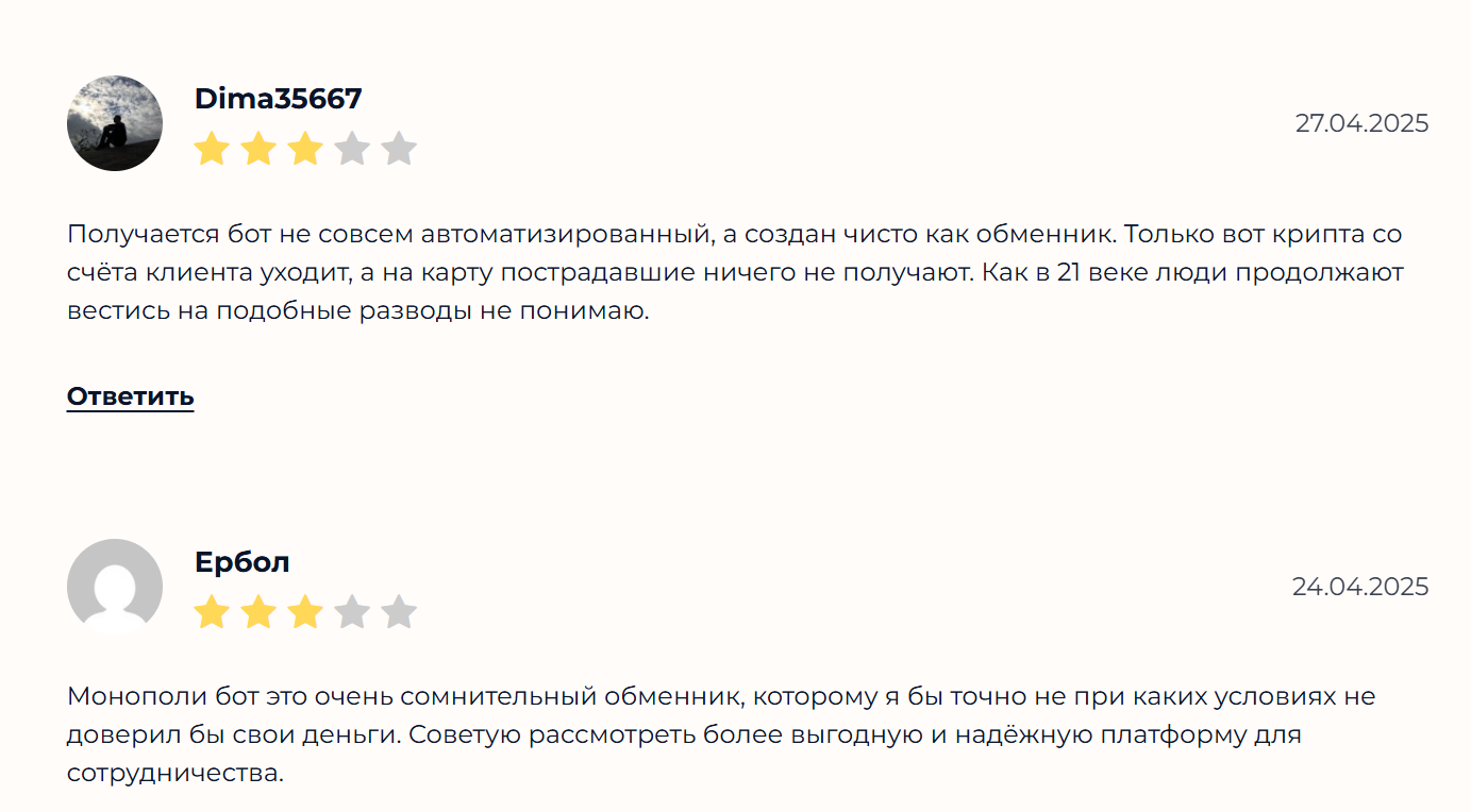 Бот выглядел подозрительно. Пользователям предлагалось переводить криптовалюту неизвестным лицам без гарантий выплаты. После отправки монет клиенты ничего не получали либо попадали в блокировку. Упоминается запуск бот Monopoly Banker, который работал по той же схеме, что и предыдущий. Эти жалобы указывают на мошенничество. Пользователей привлекают обещаниями, но никто не выполняет финансовые обязательства.