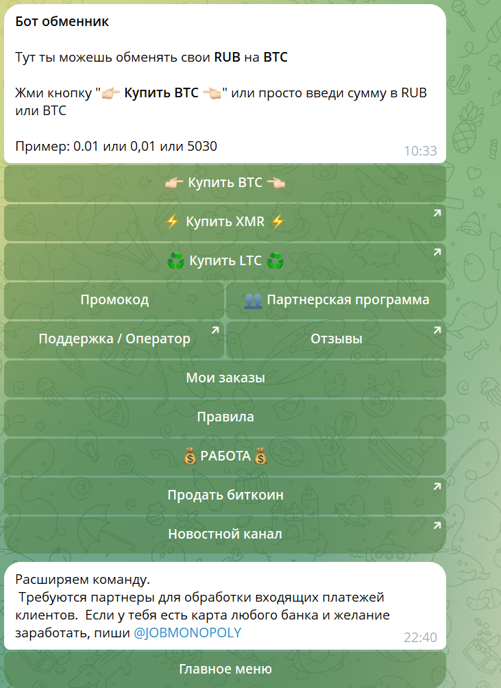 Как говорилось ранее, Job Monopoly предлагает работу с обработкой платежей для криптовалютного обменника BTC MONOPOLY. Участникам предоставляется возможность подключить свои банковские карты для приема и обработки транзакций. Работа является удаленной и подходит для людей без навыков работы. Участники могут работать в любое время. За ночные смены и выходные якобы начисляются бонусы. Процесс обработки платежей автоматизирован через Telegram-бот. Это должно минимизировать затраты времени.