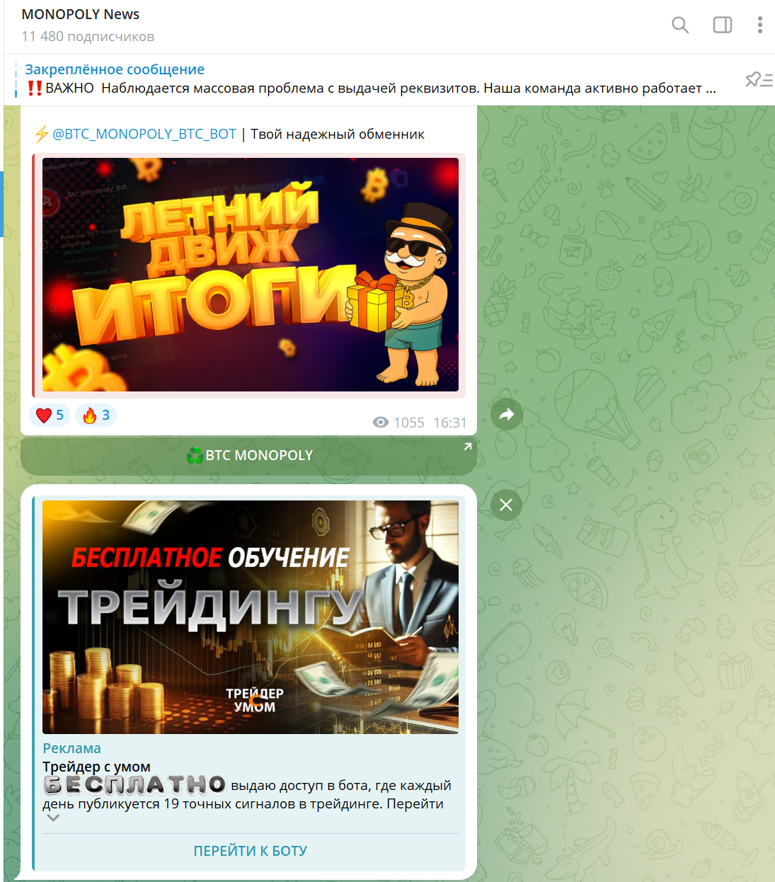 MONOPOLY News является новостным каналом обменника. Группа существует с 31 мая 2019 года и насчитывает более 11 тысяч подписчиков. Виден приток подписчиков и активная вовлеченность под постами. Сообщество публикует разнообразный контент: