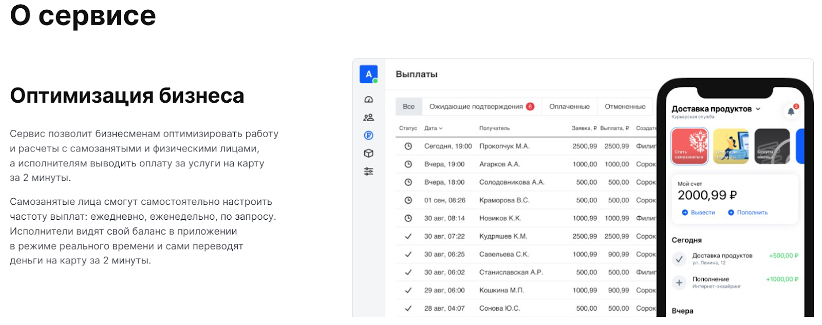 - Система для проведения мгновенных платежей самозанятым. Время перечисления денег составляет до 2 минут; можно настроить периодичность выплат.