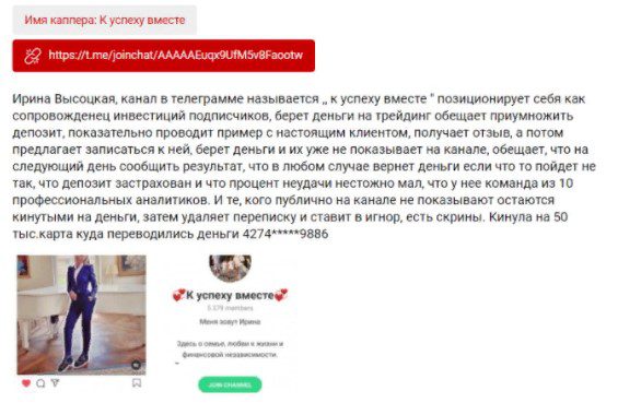 Наши эксперты внимательно проанализировали работу Телеграмм канала Ирины Высоцкой К успеху вместе и отзывы пользователей о нем. Подписчикам здесь обещают помочь заработать на трейдинге, а на самом деле просто крадут их деньги. Мы советуем держаться от этих мошенников подальше.
